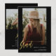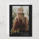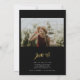 um design moderno minimalista a preto que apresenta um roteiro de caligrafia em ouro e uma foto dourada na frente da placa, e uma foto de segundo junto com informações personalizadas no verso.