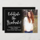 Bonito letra de script de pincel com estilo manuscrito branco com "Celebrar o Formando" num estilo de diversão artística. Adicione sua foto para um anúncio de graduação personalizada criativo, preto e branco.