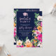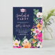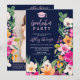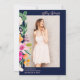 Chamando classe de 2024! Ilustração elegante e ousada das flores primavera de verão com bonito convite à festa de formatura de jardim de flores selvagens sobredimensionadas, com uma tipografia moderna de caligrafia, com flores brilhantes, cor-de-rosa-neon, laranja, verde e amarela, sobre fundo azul-marinho. Adicione sua foto atrás.