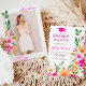Chamando classe de 2024! Ilustração elegante e ousada das flores primavera de verão com bonito convite à festa de formatura de jardim de flores selvagens, grandes dimensões, com uma tipografia moderna de caligrafia com néon brilhante, flores rosa, laranja, verde e amarela, em fundo branco. Adicione sua foto atrás.