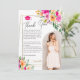 Celebre este marco com uma nota sincera usando este Cartão de Graduação de Boho Wildflower Obrigado. Apresentando um delicado design floral de aquarela em tons cor-de-rosa, laranja e ouro, com um detalhe charmoso do boné de formatura, e sua foto favorita é perfeita para agradecer aos amigos, à família e aos mentores pelo seu apoio. Ideal para segundos graus ou formandos universitários, este cartão acrescenta um toque pessoal e atencioso à sua gratidão.
