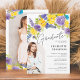Celebre o marco da graduação com nosso convite elegante! Adorado com bonito flores púrpura, azul e amarelas pintadas à mão, aquarela, ao lado de flores amarelas e flores silvestres, este convite expele charme e sofisticação. A moderna fonte elegante adiciona um toque de refinamento ao design. Apresentando uma foto em forma de arco na frente e uma segunda foto no verso, personalize seu convite com memórias carinhosas da jornada do formando.