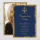 Convite para festa de formatura da escola de direito azul e ouro elegante com quadro de brilho dourado e foto ao contrário. Copyright Elegant Invites, todos os direitos reservados.