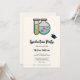 Convite de formatura com uma ilustração fofa de um tubo de ensaio segurando líquido amarelo e um balão/becher arredondado segurando líquido verde com bolhas vermelhas.