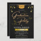 Convite para uma elegante cerimônia de graduação em preto e ouro com um boné brilhante, confetti e fita sobre fundo preto.