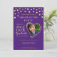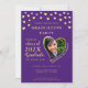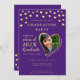 Crie os convites elegantes para a graduação em roxo e ouro com uma fotografia em forma de coração do seu formando e decorado com os corações ouro amarelos. Use a modelo para personalizar esses convites para uma classe de formando 2025 ou outro ano. O nome (primeiro e sobrenomes são alterados separadamente), a data do evento, o endereço e as informações de RSVP também são fáceis de personalizar usando o modelo.