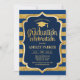 Convite festa de formatura para homens ou mulheres. Cartão de convite elegante em azul marinho e ouro. Design moderno simples com faixas, boné, dourado falso e letra de script de tipografia. Perfeito para uma comemoração de na moda.