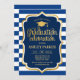Convite festa de formatura para homens ou mulheres. Cartão de convite elegante em azul marinho, branco e ouro. Design moderno simples com faixas, boné, dourado falso e letra de script de tipografia. Perfeito para uma comemoração de na moda.