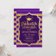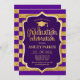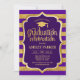 Convite festa de formatura para homens ou mulheres. Cartão de convite elegante em roxo e ouro. Design moderno simples com faixas, boné, dourado falso e letra de script de tipografia. Perfeito para uma comemoração de na moda.