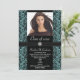Foto personalizada e texto. Um fundo preto elaborado e ricamente decorado apresenta uma fita e uma imagem de broche de joia facetada que lembra uma decoração feminina antiga.