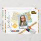 Adicione estilo e um toque moderno à graduação do seu filho com este layout de fotograma com itens escolares no fundo. O roteiro de "graduação" à esquerda e os itens são um ônibus escolar, um letreiro de passagem escolar, uma régua, marcadores coloridos e uma paleta de tinta aquosa. Três quadros poka-ponto (amarelo, verde e azul) com o topo como modelo de foto. Adicione nome e ano de graduação em foto. Listras únicas no topo e no fundo sobre fundo branco em frente e atrás. Os modelos de texto estão incluídos.