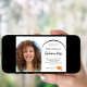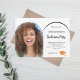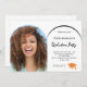 Adicione sua própria foto vertical do formando. Um quadro fotográfico em forma de arco. Uma cor branca de fundo. Personalize e adicione um nome e detalhes da parte.
