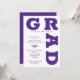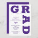 FORMANDO em curvas de letras roxas em negrito ao redor das bordas desses convites de festa de formatura em fundo branco. CONSULTE TODA A COLEÇÃO de combinações de cores pré-feitas, placas de papel, guardanapos, caixas de favor e convites de festa de formatura em nossa loja.