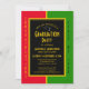 Na moda, convite à graduação moderna com tema vermelho, ouro, verde e preto. A mensagem lê PARABÉNS. Fundo preto simples com GRADUAÇÃO em sutil padrão. O texto do marcador de posição é personalizável, portanto, simplesmente adicione seu nome e detalhes. Parte da coleção GRADUATION de Designs Bereanos.