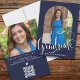 Este design apresenta uma fotografia de formando de graduação de formando, uma elegante imagem de arco moderno minimalista, com letra de escrita de na moda de tendência, com cores da escola estilo azul marinho, para segundo grau ou mais velho universitário, com design de tipografia elegante clássica, um roteiro de caligrafia rico, um cartão de de graduação formando, um cartão de anúncio de graduação elegante, com elegância simplista estilo moderno