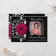 Anúncio de graduação floral elegante, bonito e fresco, com uma foto de solteiro, apresenta fundo preto com roldanas sutis, e um design de primeiro plano de espiral branco vívido, com flor rosa brilhante, fochsia magenta gerbera gerber. Muito elegante para uma formando feminina feminina.