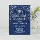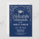 Convite festa de formatura para homens ou mulheres. Cartão de convite elegante em azul marinho e prata. Design moderno simples com faux glitter confetti, uma fonte de script de boné e tipografia. Perfeito para uma comemoração de na moda.