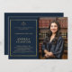 Celebre seu formando na Faculdade de Direito - ou você mesmo - com este elegante e clássico convite de fotos da graduação na Faculdade de Direito com um tema de marinho e ouro. Substitua as escalas de justiça pelo logotipo da sua escola ou deixe-a como está. A design de tipografia contemporânea é elevada pelas matizes douradas e pela disposição minimalista. Um quadro de ouro esfregado decora a área de tipografia. Personalize cada linha de texto. Marinho e ouro falso.