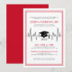 Este convite de formatura elegante e moderno apresenta uma mistura elegante de fontes serifadas clássicas e tipografia moderna e limpa, em uma combinação de preto e vermelho para um visual atemporal e contemporâneo. O design exibe uma linha de batimentos cardíacos de EKG com um boné de formatura no centro, exibindo "Turma de 2026" na parte superior e o ano de formatura abaixo. Uma moldura fina de linha dupla com sotaques vermelhos adiciona um toque refinado, tornando-o perfeito para celebrar um graduado de medicina ou enfermagem.