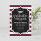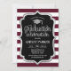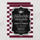 Convite festa de formatura para homens ou mulheres. Um cartão de convite elegante em burgundy maroon, preto, branco e prata. Design moderno simples com faixas, um boné, falso brilho prateado e letra de script de tipografia. Perfeito para uma comemoração de na moda.