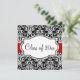 Na moda, forma quadrada elegante e elegante, design de fundo damasco preto e branco, com fita vermelha e forma de quadro branco. Um belo anúncio de formatura ou um convite à casa aberta. Todos os Designs Copyright ©www.CustomInvitesOnline.com