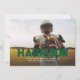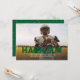 Apresentando um nome verde ousado em uma foto de solteiro, este anúncio de graduação é perfeito para um atleta graduado. Com uma fonte do estilo letterman, seu design pode ser personalizado com todos os detalhes do formando na frente. A parte de trás verde inclui espaço para duas fotos adicionais, assim como texto que pode ser usado para detalhes de convites para festas de formatura, planos futuros ou qualquer outra coisa que você queira. Com seu estilo esportivo, esse anúncio de graduação e convite é excelente para caras e meninas e trabalha com uma variedade de fotos.