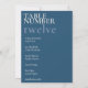 Um fundo azul poeirento e sofisticado e elegante tipografia serifônica. As fontes ousadas e clássicas são dispostas em um layout limpo e moderno, fazer cada número de tabela e nome de convidado facilmente legível. Este design minimalista combina simplicidade com detalhes chamativos, aprimorando sua decoração de mesa para casamentos de jardim, ou qualquer evento formal, mas contemporâneo. A sombra azul macia e acinzentada se emparelha perfeitamente com arranjos florais neutros, pastéis ou arrojados e acessórios modernos de mesa, oferecendo um ambiente subestimado, mas de escala alta, para o seu grande dia.