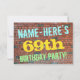 Este design de convite de aniversário divertido apresenta uma mensagem como "NAME-HERE'S 69th FESTA DE ANIVERSÁRIO!", onde o nome pode ser personalizado, na frente. O fundo apresenta uma representação de uma parede de tijolos constituída por alguns tijolos de cor castanha avermelhada. O texto de mensagem personalizável na parte frontal apresenta cores como azul, amarelo e verde, e tem uma aparência inspirada pelo grafite pintado. A parte traseira apresenta uma mensagem personalizável que pode incluir detalhes relevantes sobre a festa de aniversário. Convites de aniversário como esta podem ser uma maneira divertida de convidar a família e os amigos para uma festa de aniversário que está a ser feita para alguém que está a celebrar o seu sexagésimo nono aniversário. [~Z0000287]