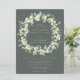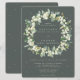 Snowberries pintados à mão e caules de eucalipto dispostos em uma bela coroa botânica contra um fundo verde cinza escuro. Todo o texto é totalmente editável e os pontos espalhados na frente e atrás podem ser excluídos antes de encomendar, se preferir. Por favor, visualize esta Coleção na minha loja para convites com opções de redação alternativas, cores/formas/tamanhos diferentes e para itens coordenados.