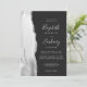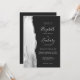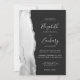 The left-hand edge of this elegant modern wedding invitation features a gray and white watercolor agate border trimmed with faux silver glitter. The customizable text combines handwriting, copperplate and italic fonts silver gray on a slate black background. The reverse side provides space for wedding details on a solid slate background, along with a QR code guests can scan to visit your website and RSVP, which saves the cost of printing and mailing separate RSVP cards.