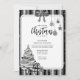 Embrace contemporary elegance with this sophisticated invitation featuring a stylish Christmas tree with wrapped presents against a chic striped gray and black background with falling snowflakes. The modern monochrome aesthetic and playful ornament border create perfect ambiance for trendy holiday celebrations, minimalist parties, or stylish contemporary Christmas gatherings.