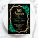 Surpreenda o 50º Convite de aniversário. Preto feminino e design verde esmeralda com ouro brilhante falso. Apresenta rosas, fonte de script e confetti. Perfeito para uma elegante comemoração de aniversário feminina. Pode ser personalizado para mostrar qualquer idade. Impressos convites Zazzle ou modelo de impressão digital instantânea para download.