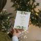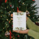 Foca de Natal verde com rosas brancas, pinecones e cardápio de Natal moderno e verde. Tipografia moderna em verde e castanho claro — menu de Natal minimalista.