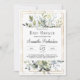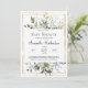 O convite para o chá de fraldas de tendência - neutro em relação ao gênero - apresenta uma folhagem de vassoura verde com eucalipto fresco e forma geométrica dourada