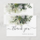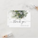 cartões de agradecimentos plano com água verde, buquês pendurados de goma azul Eucalipto. Este cartão é acentuado com um moderno roteiro manuscrito, obrigado você. Copyright © 2016-2020 Bombino Design™.