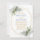 O Cartão de Convite para Casamento de Cores Biológicas Elegantes Modernos inclui folhas de eucalipto, folhagem botânica verde, folhas azuis empoeiradas e outros belos lençóis botânicos. Dourado quadro geométrico, azul empoeirado e roteiro Dourado, foto de volta.