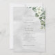 Um convite de casamento moderno e minimalista, com elegante cor d'água, eucalipto verde e delicadas flores brancas, de fundo rústico macio. Perfeito para casamentos de jardim, cerimônias de vinhedos, eventos de clubes de campo ou celebrações ao ar livre. Este eterno e designs frescos estão à procura de um tema de casamento limpo, botânico e romântico.