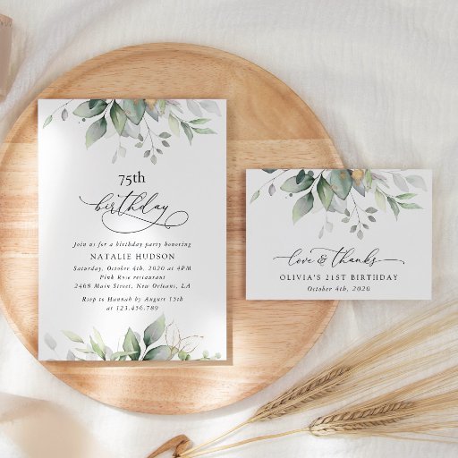 Convide amigos e família de estilo e dê o tom para o seu dia especial com este charmoso convite de aniversário. Design apresenta folhas de eucalipto e verde em fundo branco.