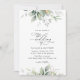 Convide amigos e família em estilo e dê o tom para seu dia especial com este encantador convite para o casamento. Design apresenta folhas de eucalipto e verde em fundo branco.