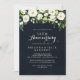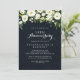 Este convite de bodas de ouro 50 anos de casamento com flores brancas greenery é perfeito para um evento rústico. O design apresenta elegantes peônias brancas em aquarela com folhagem verde em um fundo azul escuro. Altere o número para celebrar qualquer marco de aniversário de casamento.