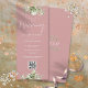 Um convite de casamento floral verde com tipografia elegante de escrita de caligrafia e o seu website de casamento Código QR num fundo de rosa empoeirado. Projetado por Thisnotme©