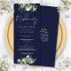 Um convite de casamento floral verde com uma elegante tipografia de escrita caligráfica num fundo azul marinho. Projetado por Thisnotme©