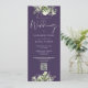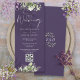 Um convite de casamento floral verde com tipografia elegante de escrita de caligrafia e o seu website de casamento Código QR em fundo roxo. Projetado por Thisnotme©