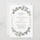 Este convite de casamento elegante e tenebroso apresenta uma forma geométrica falsa de ouro cercada por belos galhos verdes.