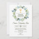 Celebrar a Primeira Comunhão do seu filho com este elegante convite com uma coroa verde e um belo cálice. Perfeito para uma comemoração memorável da Primeira Comunhão. Espanhol / Espanhol: Celebra la Primera Comunion de tu hija con esta invitación.
