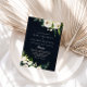Este convite para o casamento royal azul floral verde é perfeito para um casamento russo. O design apresenta elegantes pedras brancas de aquarela com folhagem verde em fundo azul escuro.