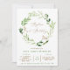 Um convite 2-em-1 para as celebrações de batismo e segundo aniversário do seu pequeno. Este design apresenta uma camada aquosa de folhas e bagas verdes com "Baptism + segundo aniversário" em letra castanha do estilo caligráfico moderno. O dorso apresenta um padrão de madeira marrom-aquosa.