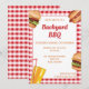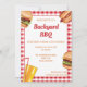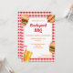 A ilustração de Destei apresenta alguns fast food incluindo uma bebida laranja com um canudo vermelho, um cachorro-quente com ketchup e mostarda em cima e um hambúrguer que tem um pão com sementes de sésamo que é recheado com queijo, alface, carne, tomate, ketchup e picles. A cor de fundo geral é branca, enquanto as bordas apresentam um padrão xadrez vermelho. O padrão xadrez vermelho é colocado do outro lado do cartão também. Há várias áreas de texto personalizáveis para informações do evento. Este design é ideal para churrascos no quintal, festas de aniversário, reuniões familiares e piqueniques, por exemplo.