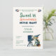 Um divertido convite de aniversário 16 de Halloween com um tema noturno de filme, com um personagem gremlin a operar um projetor de filme, em aquarela. Elegante, moderno, simples e divertido, vai agradar aos fãs das noites de cinema e da diversão de Halloween e a uma garota celebrando seu décimo sexto aniversário com uma noite de cinema ou soneca de Halloween.