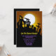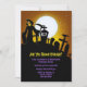 O Ceifador Grim em um quintal com lua de cheio e fundo do céu amarelo. Design muito divertido e assustador para seus convites para festas de Halloween.